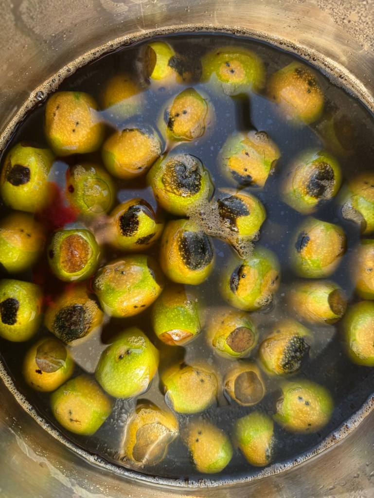 Nach 24 Stunden sind schon deutliche Veränderungen sichtbar. Es duftet auch ganz herrlich nach Walnussbaum. Durch das Anschneiden und Anstechen der unreifen Walnüsse wird das Fruchtfleisch verletzt. Dabei treten Bitterstoffe aus, deren Konzentration beim Wasserwechsel schrittweise verringert wird. Außerdem werden Enzyme freigesetzt und eine Vorstufe des schwarzbraunen Farbstoffs der Walnuss. In einer enzymatischen Reaktion, vergleichbar mit dem Braunwerden von Äpfeln, bildet sich die schwarze Färbung aus.